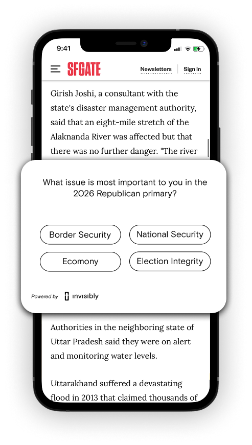 Inaccurate data can sink campaigns. Invisibly's advanced polling technology combines science and innovation to deliver faster, more affordable, and more precise results than established pollsters.